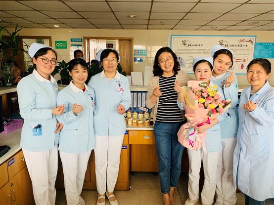 活動前夕副院長施琴帶領護理部主任及相關工作人員深入臨床一線慰問奮戰(zhàn)在工作崗位上的白衣天使,為他們送上一份精美的蛋糕,并向他們致以節(jié)日的問候。